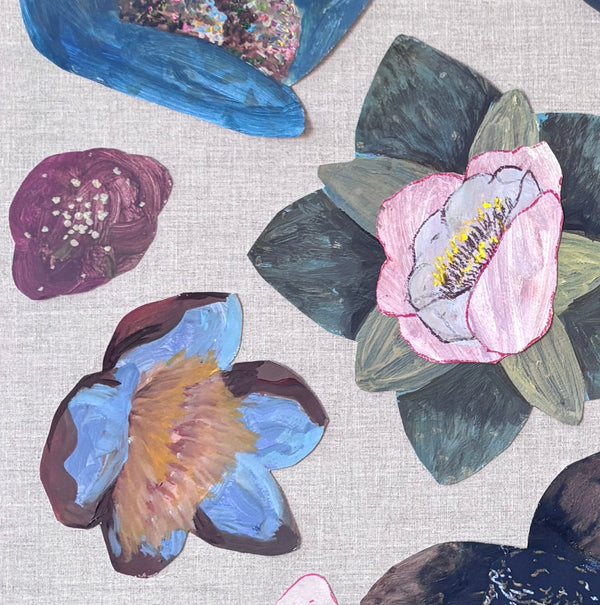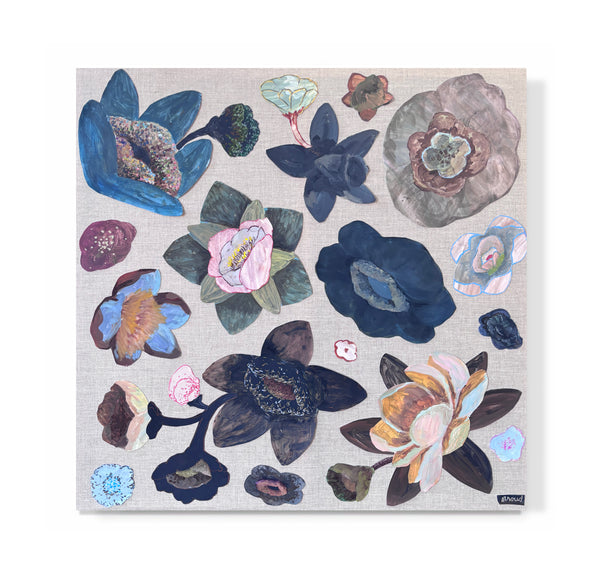 Her botanical collages are an homage to the floral arrangements and installations she sees at her wedding paintings each weekend. Drawn to the almost puzzle piece-like characteristic of the florals, Caroline is inspired by how each flower fits perfectly within the arrangement and complements one another in color and shape to create a cohesive bouquet. Caroline deconstructs these bouquets into a swirling pool of botanical shapes that lay flat on the canvas. Creating multiple layers of contrasting designs on each flower- quick staccato marks layered on top of wide and lazy brush strokes- she is able to relay the very busy yet contained manner of the wedding bouquets she admires.