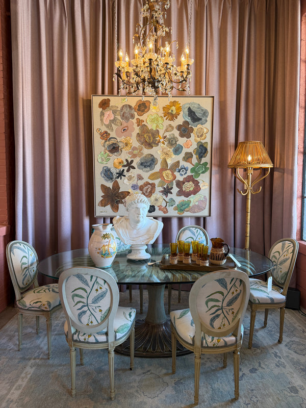 Her botanical collages are an homage to the floral arrangements and installations she sees at her wedding paintings each weekend. Drawn to the almost puzzle piece-like characteristic of the florals, Caroline is inspired by how each flower fits perfectly within the arrangement and complements one another in color and shape to create a cohesive bouquet. Caroline deconstructs these bouquets into a swirling pool of botanical shapes that lay flat on the canvas. Creating multiple layers of contrasting designs on each flower- quick staccato marks layered on top of wide and lazy brush strokes- she is able to relay the very busy yet contained manner of the wedding bouquets she admires.