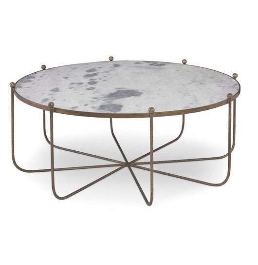 Low, round coffee table with U-shaped pitted brass spindle legs culminating with round finials. Each piece is finished by hand by artisans and is unique. Granite and Marble are natural materials and will vary.