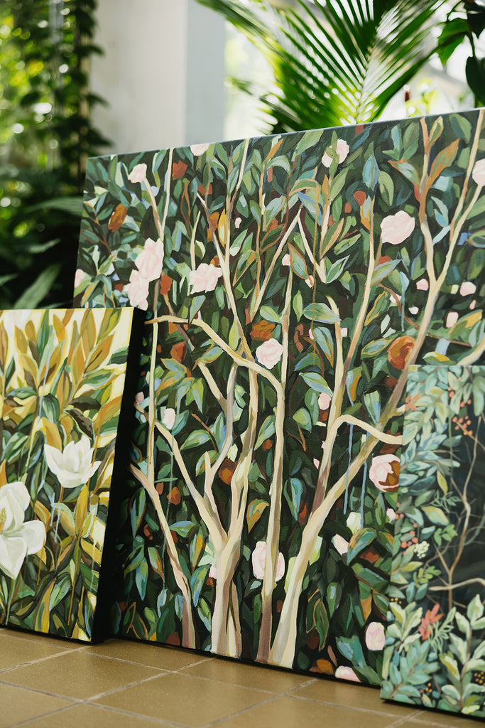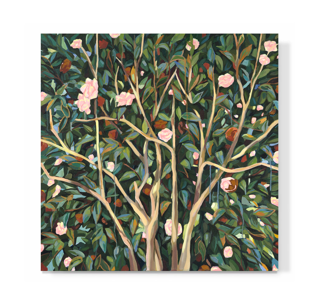 Our Winter Camellia was the first painting in this series, and the one that challenged me the most. Begun just before I learned I was pregnant with our daughter and completed over a year later with my sweet baby by my side - this painting pushed my limits and stretched my ability. In hindsight I can see that starting a painting in my first trimester and trying to finish it in the early months of postpartum probably added several layers to the difficulty of this piece. For those same reasons though, this painting is one of the most dear and sentimental to me.