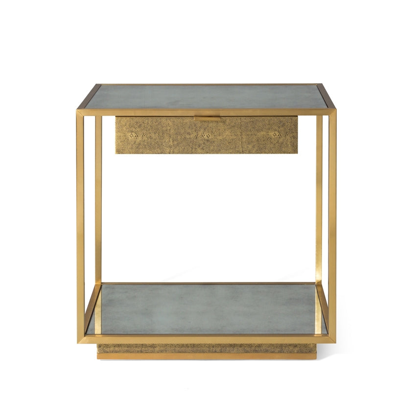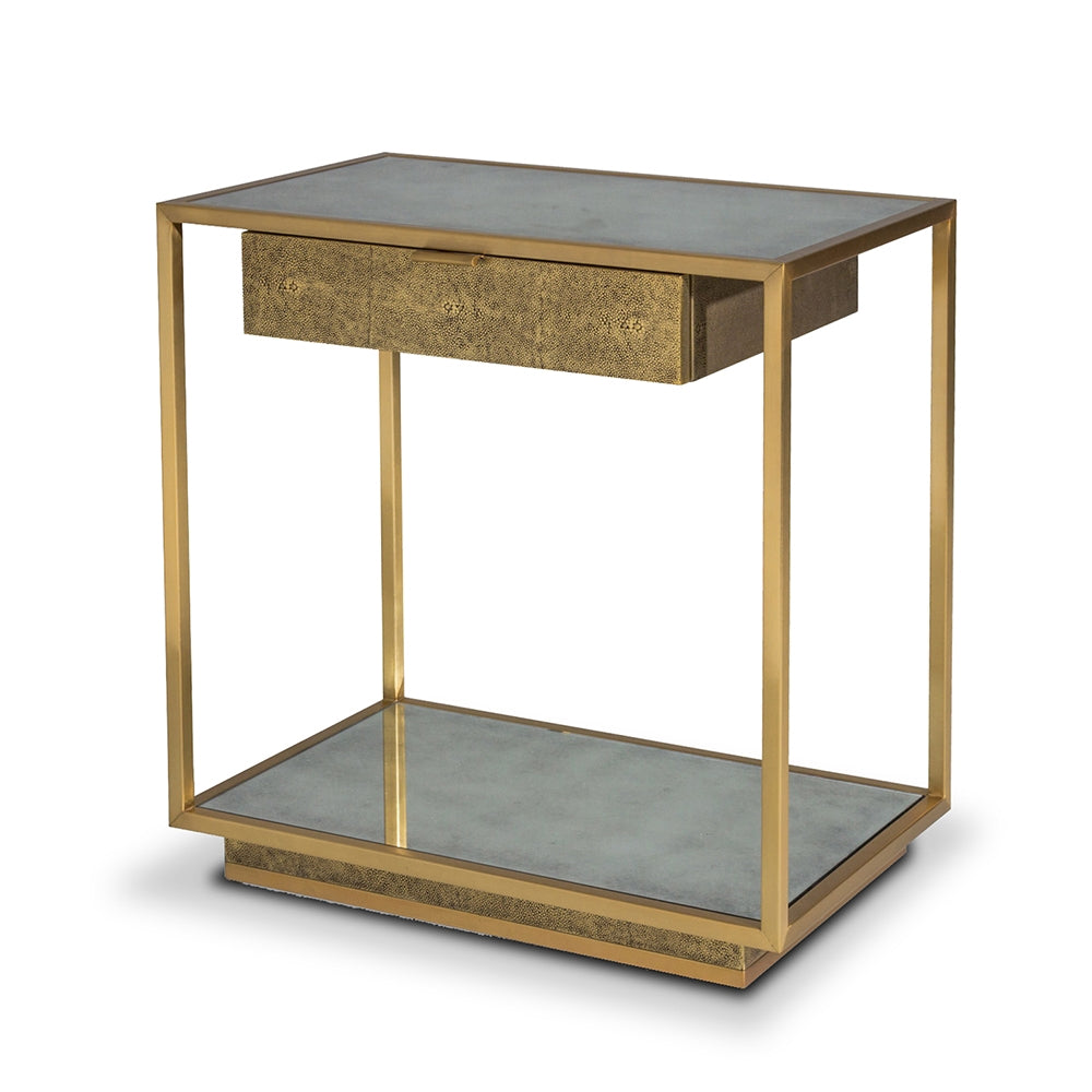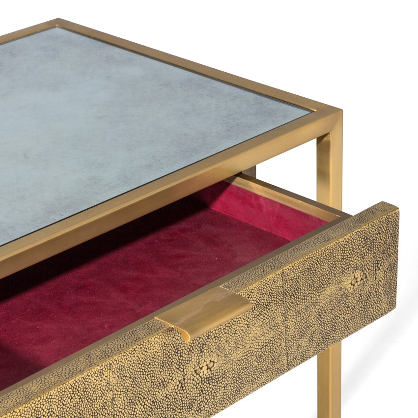 The Aged Brass frame appears to float on a recessed Brass coated Faux Shagreen base and drawer with an Aged Mirror top.