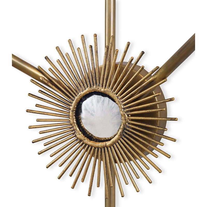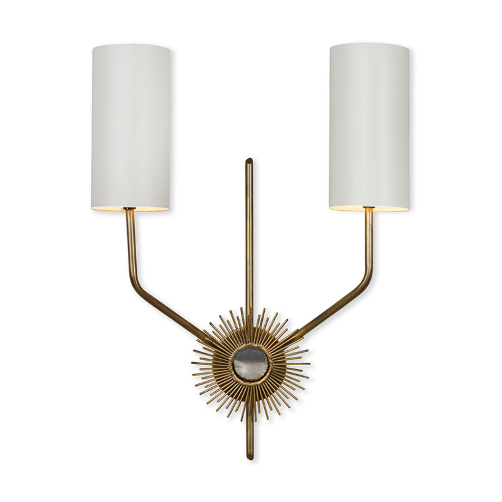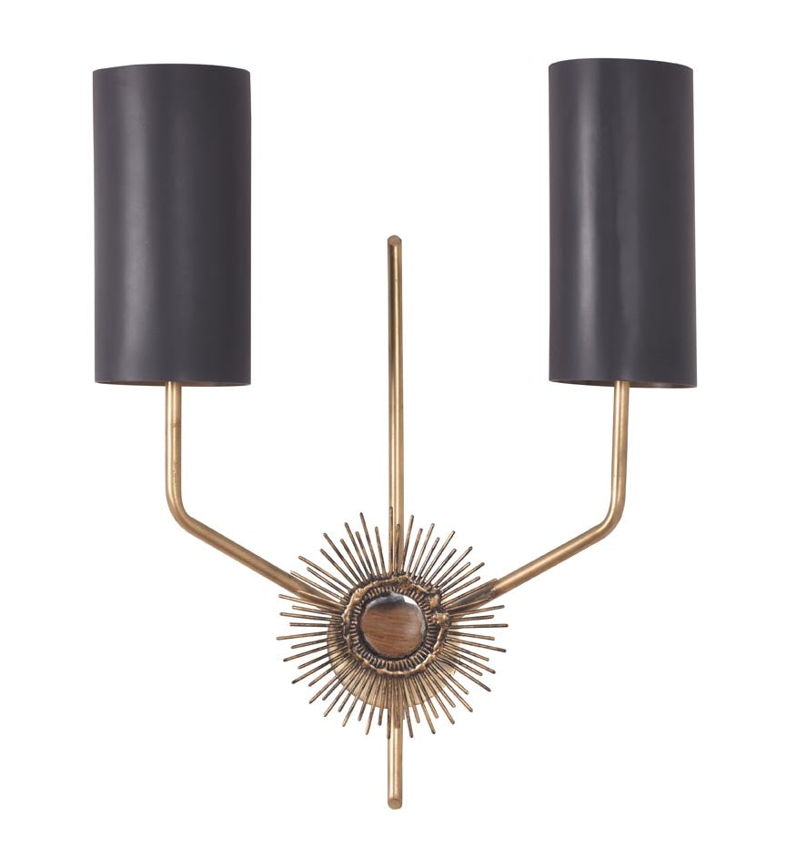 Double Lamp heads with tall slender black shades emerge from a mounting plate artfully decorated with a sunburst.
