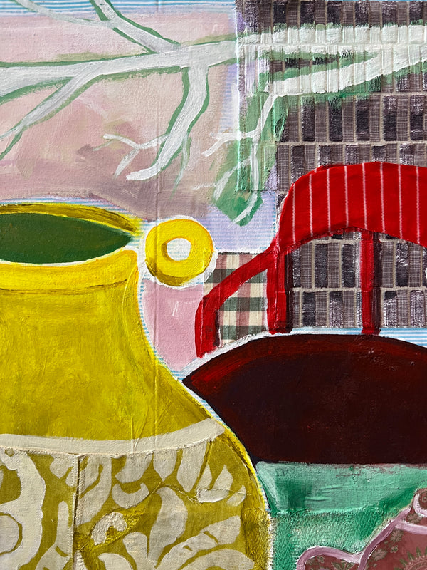 Zelda's work explores a fascination by the interplay of bringing nature indoors and extending the comforts of the indoors outward. To express this, she uses found fabrics, paper, and paint to blur the boundaries between interior space and the natural environment.